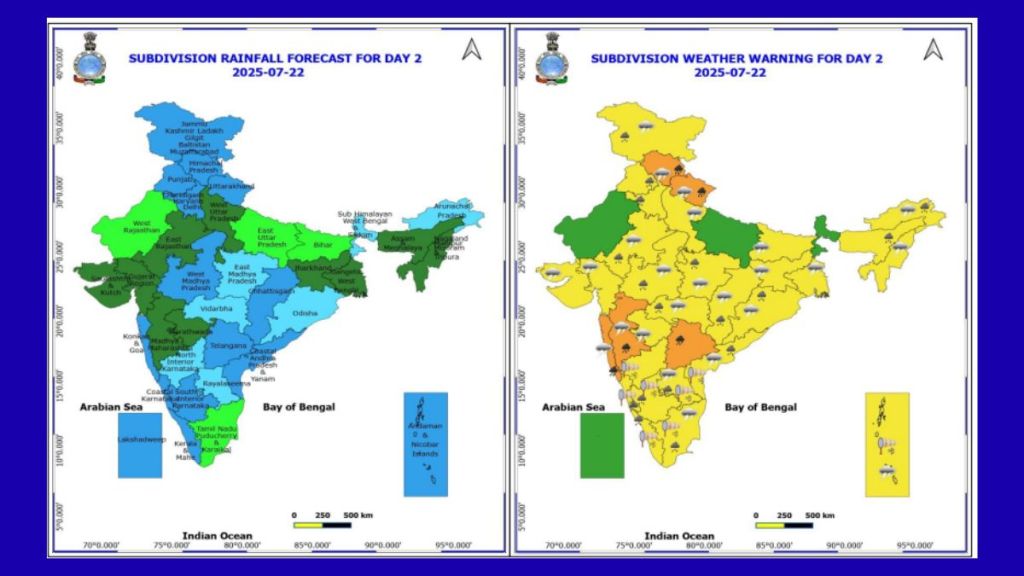 On July 22, Northwest India is expected to experience isolated very heavy rainfall over Himachal Pradesh and Uttarakhand, while heavy rainfall is likely to continue over Jammu and Kashmir. Punjab, Haryana, Uttarakhand, and West Uttar Pradesh will witness rainfall until July 24.