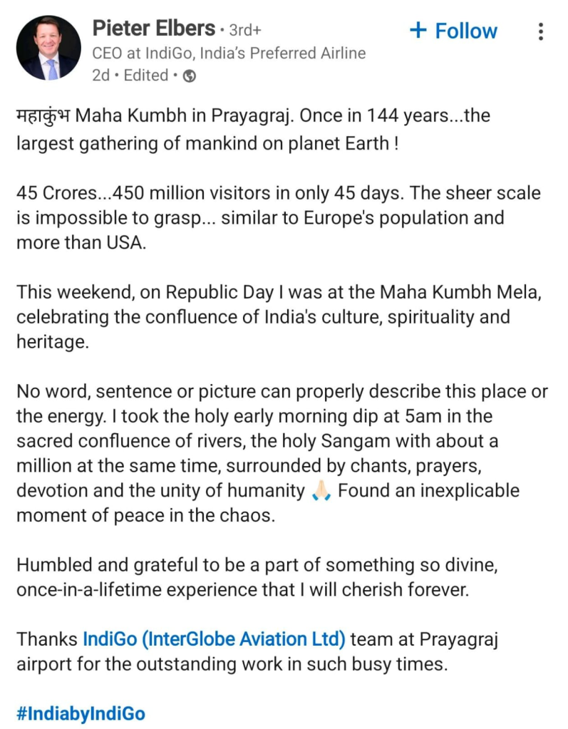 Elbers also appreciated IndiGo airline for their outstanding work at the Prayagraj airport during Maha Kumbh. He wrote, “Thanks IndiGo (InterGlobe Aviation Ltd) team at Prayagraj airport for the outstanding work in such busy times.”
