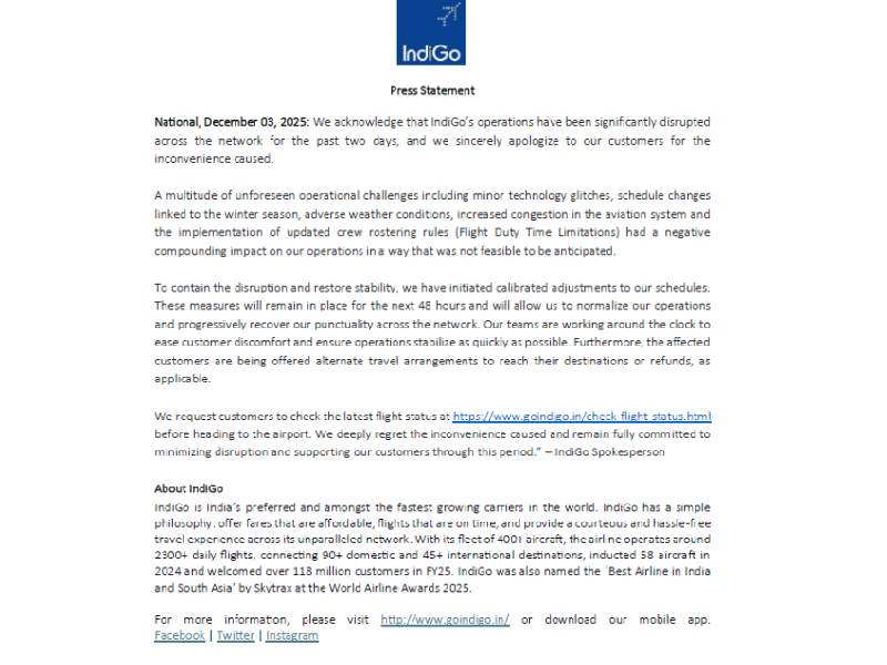 IndiGo released a statement on Wednesday evening, clarifying the reasons behind the mass cancellations and delays: