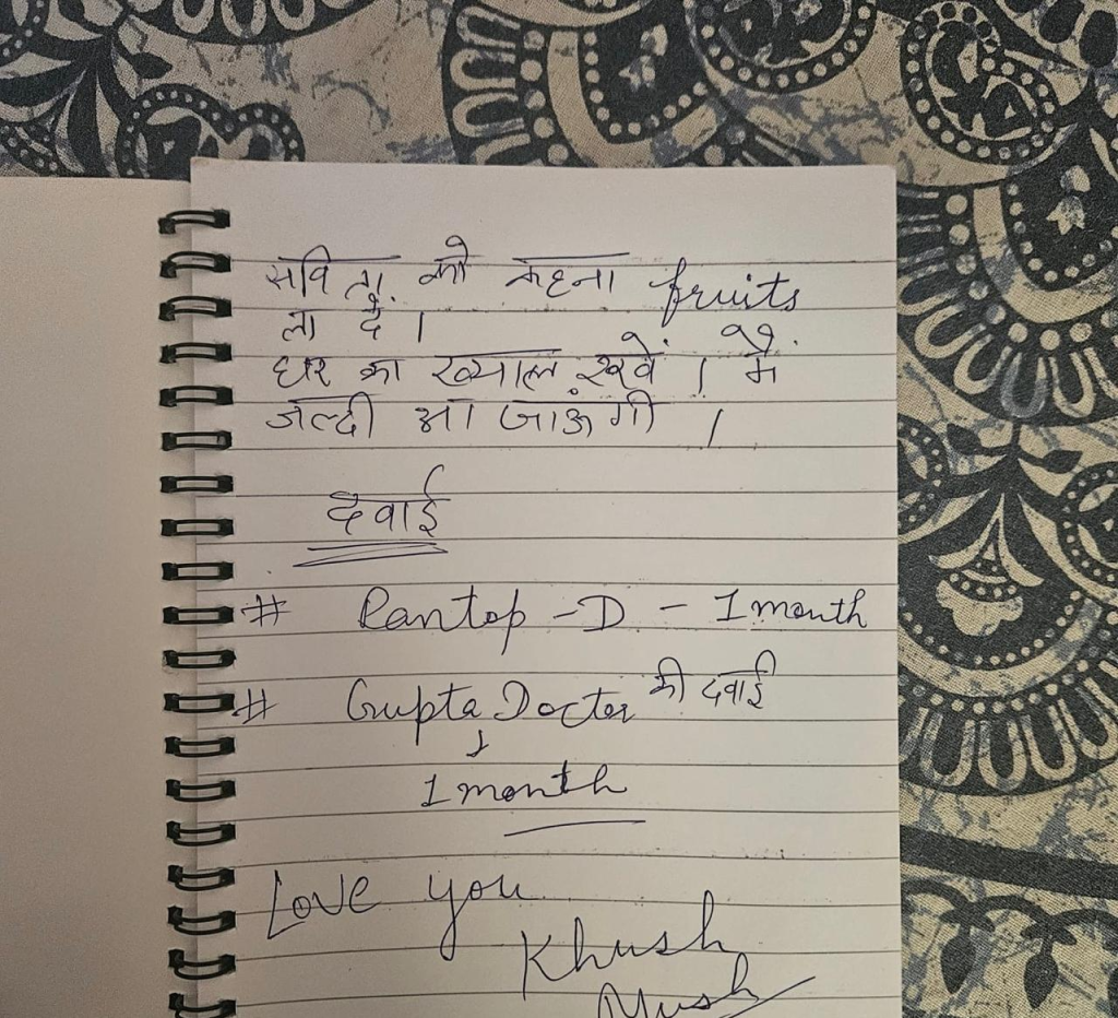 The note written by Jyoti read as: “Savita ko kehna fruits la de, ghar ka khayal rakhe, main jaldi aa jaungi.” This translate to “Tell Savita to bring some fruits. Take care of the house. I’ll be back soon.” Along with this message, name of some medicines are also mentioned. “Dawai, #Rantop D 1month #gupta doctor ki Dawai 1month,” read the note further. The note ends with “Love you Khush Mush.”