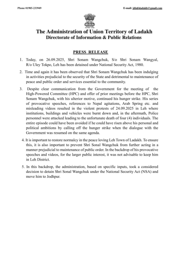 Sonam Wangchuk, a well-known activist from Ladakh, was arrested after violent protests demanding statehood and constitutional safeguards. He was shifted to Jodhpur jail on Friday. The protests left four people dead and 90 injured. For security reasons, mobile internet services have been suspended in Leh district.