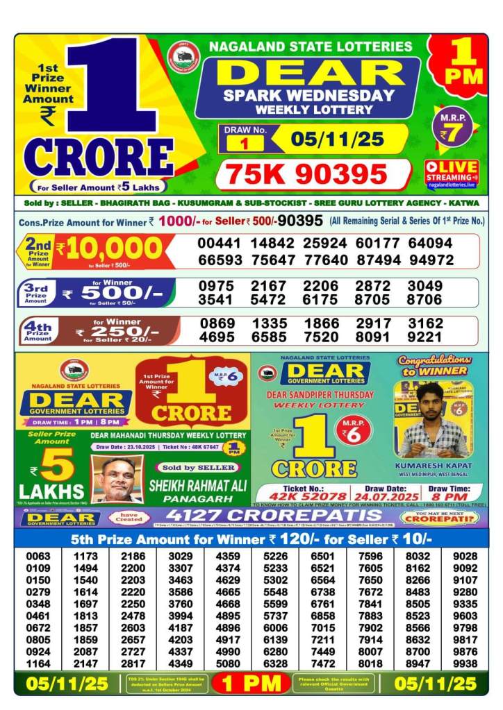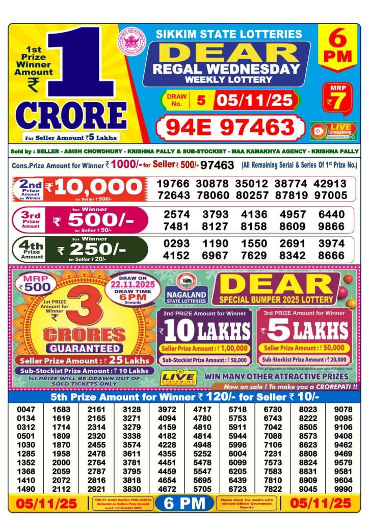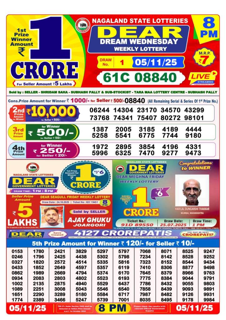 Nagaland Lottery Sambad Today: The results of the Nagaland State Lottery will be revealed in three drawings on Tuesday, November 5, 2025. The results for Dear Pelican Evening will be announced at 8 PM, Dear Cupid Day at 6 PM, and Dear Indus Morning at 1 PM. A whopping ₹1 crore is awarded as the top prize in each of the three lotteries. Stay tuned and follow News 24 for real-time results updates below. Refresh the page and scroll down to view the full list of winners.