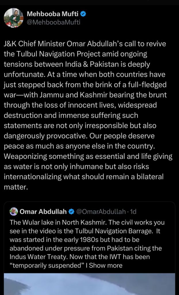 However, Mufti responded sharply to Abdullah’s remarks, labeling them as “dangerously provocative.” She cautioned against using water as a political tool amidst escalating tensions between India and Pakistan, arguing that such actions could exacerbate conflicts and lead to further suffering for the people of Jammu and Kashmir. “Weaponising something as essential as water is inhumane and could internationalise a bilateral matter,” she warned, stressing the need for peace rather than provocation.