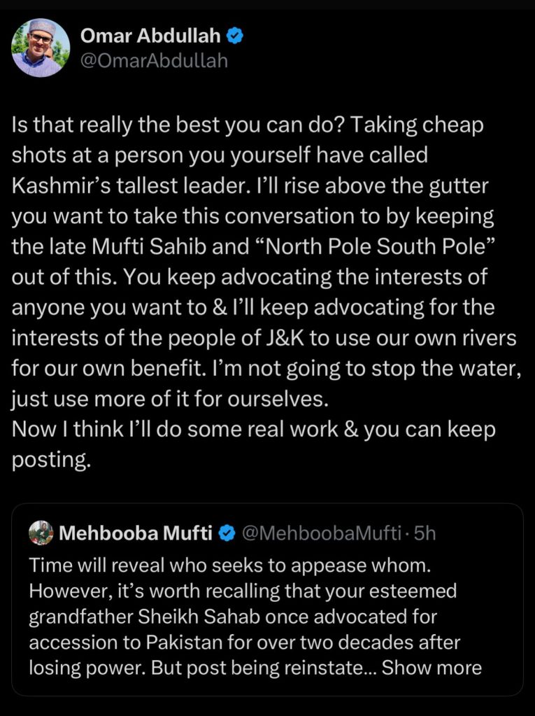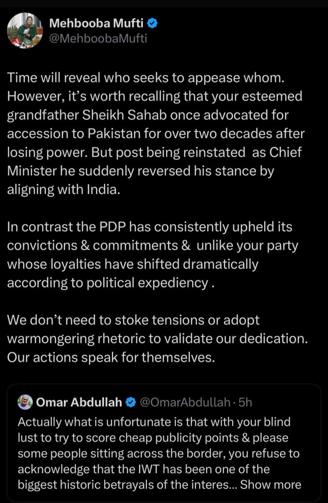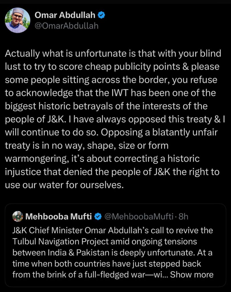 In a rebuttal, Abdullah accused Mufti of prioritizing political gains over the well-being of the Kashmiri people. He characterized her criticisms as an attempt to appease external elements while defending his call for questioning the treaty. “Opposing an unjust treaty is not warmongering. It’s about correcting a historical wrong,” he wrote.