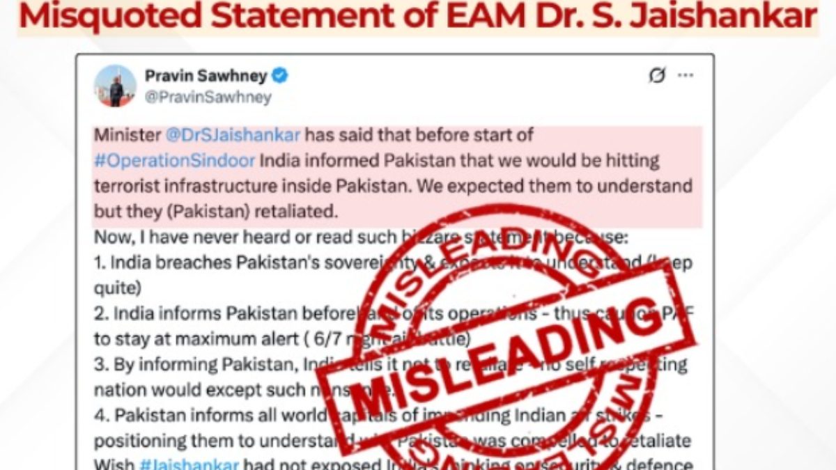 The fact check unit of the Press information bureau on Thursday flagged a social media post that falsely implied, based on External Affairs Minister DR S Jaishankar’s statement that India had informed Pakistan before the start of Operation Sindoor.