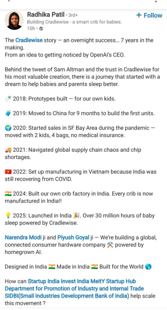As the post went viral, it caught attention of founder Radhika Patil who thanked Sam for his support and validation. She replied, “Thanks for loving us @sama. The AI god’s trust in the smarts o @cradlewise means a lot to us. Wishing you all more.” Radhika then shared Cradlewise’s Journey on LinkedIn. She stated it as an “overnight success” with 7 years in the making. She added, “From an idea to getting noticed by OpenAI’s CEO.”
