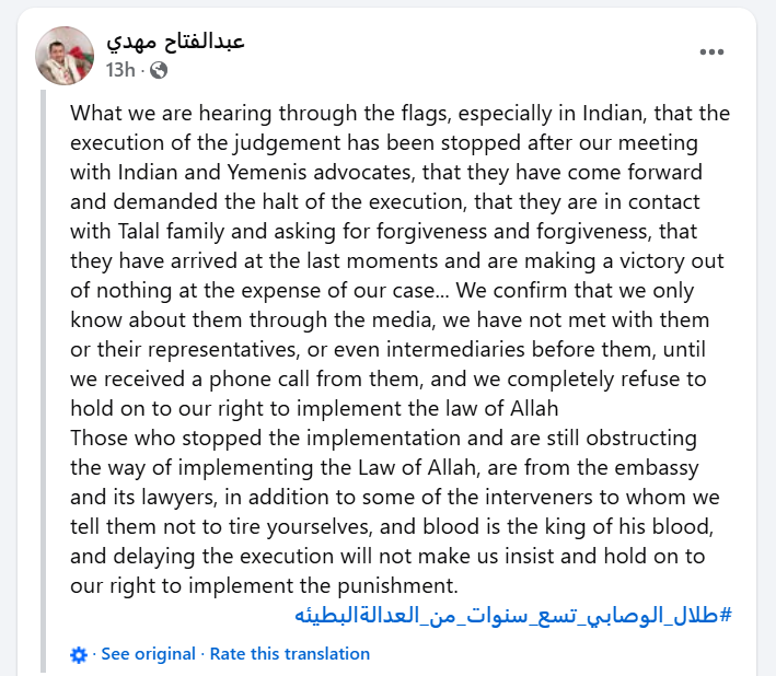 “What we are hearing through the flags, especially in Indian, that the execution of the judgement has been stopped after our meeting with Indian and Yemenis advocates, that they have come forward and demanded the halt of the execution, that they are in contact with Talal family and asking for forgiveness and forgiveness, that they have arrived at the last moments and are making a victory out of nothing at the expense of our case… We confirm that we only know about them through the media, we have not met with them or their representatives, or even intermediaries before them, until we received a phone call from them, and we completely refuse to hold on to our right to implement the law of Allah.