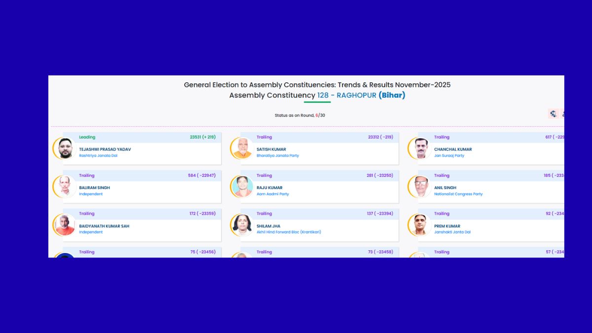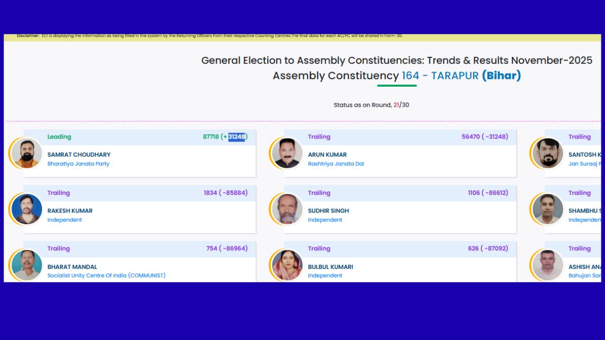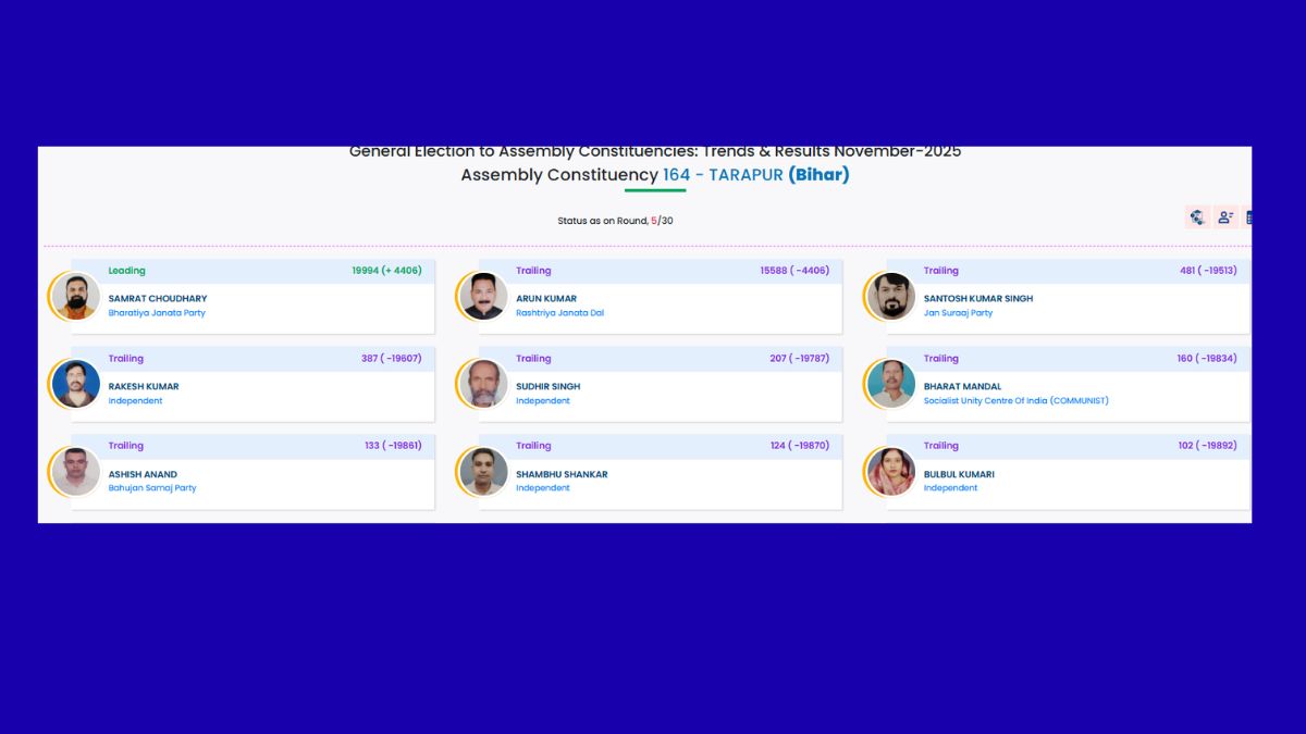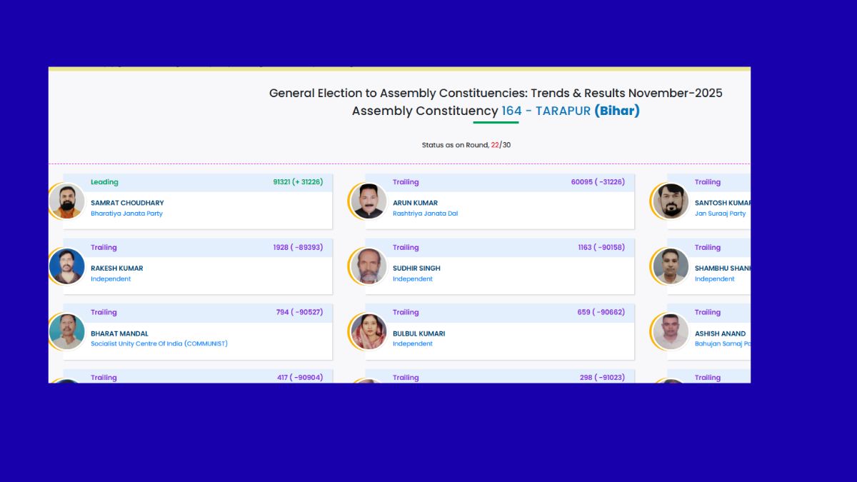 Bihar Assembly Election 2025 Results: Stay tuned for real-time updates, with special focus on the Tarapur constituency, where the high-stakes contest between Samrat Choudhary (BJP) and Arun Kumar (RJD) is being closely watched.