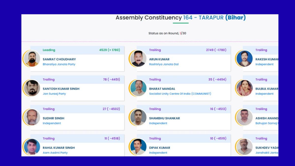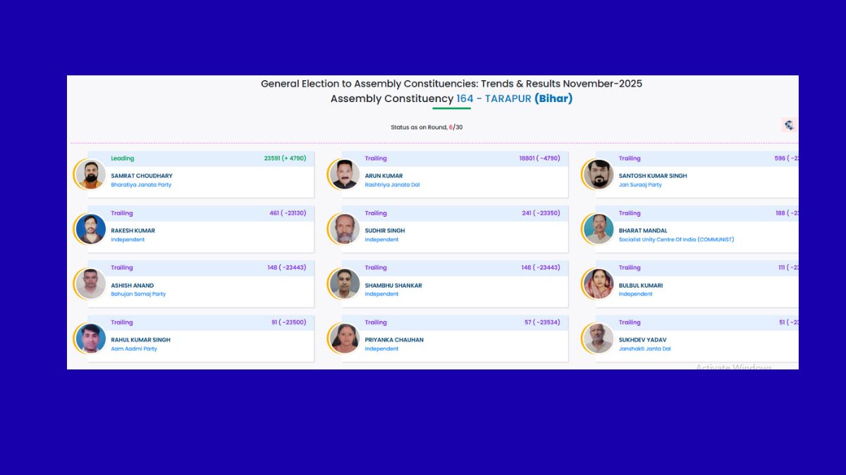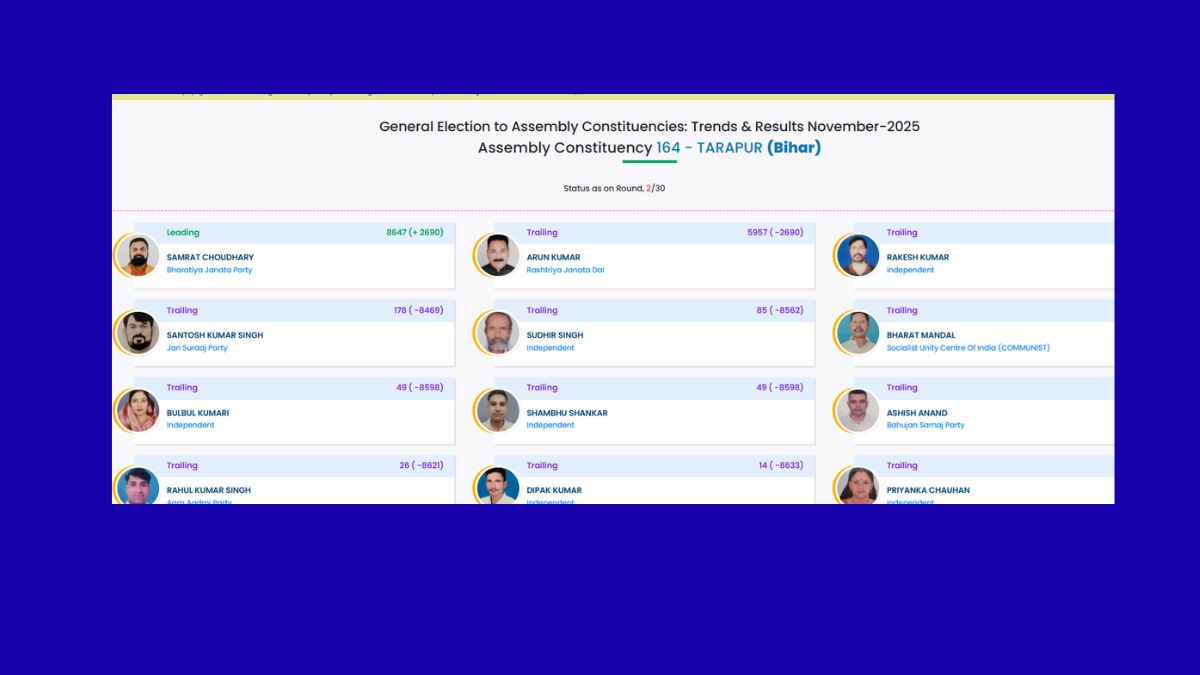 With vote counting underway for the Bihar Assembly Election 2025, all eyes are on the Tarapur constituency in Munger district. The contest is particularly noteworthy as Samrat Choudhary (BJP) faces off in a direct battle with Arun Kumar (RJD). Tarapur has long been a stronghold of the Janata Dal (United) (JD(U).