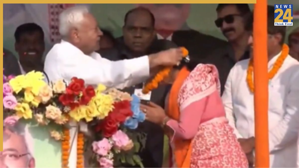 In the video clip, the Chief Minister is seen trying to garland BJP candidate Rama Nishad when he is stopped by JD(U) MP Sanjay Jha. Later, he handed the garland to Nishad, and she accepted it, but within seconds, he garlanded her himself, remarking to Jha, “Gazab aadmi hai.”
