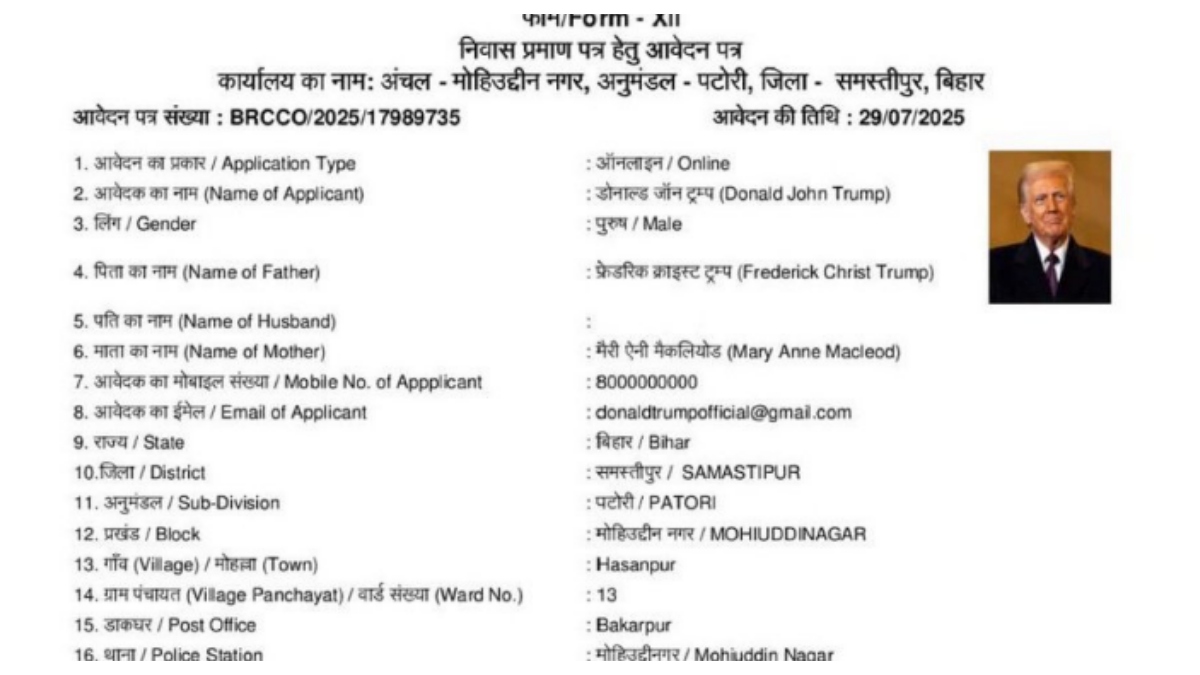 Amid a rising trend in Bihar, where the emergence of fake applications has been discovered in recent weeks, with names such as ‘Dog Babu’, ‘Nitish Kumari’, and ‘Sonalika Tractor’ from districts such as Patna, Nalanda, and East Champaran, yet another bizarre incident has come to light. This time, an application has been filed for a residence certificate in the name of US President Donald Trump in Samastipur district. The application was submitted online on July 29 in the Mohiuddinnagar block. Officials say it mentioned the village Hasanpur, Ward No. 13, Post Bakarpur, Police Station Mohiuddinnagar, District Samastipur as the address.