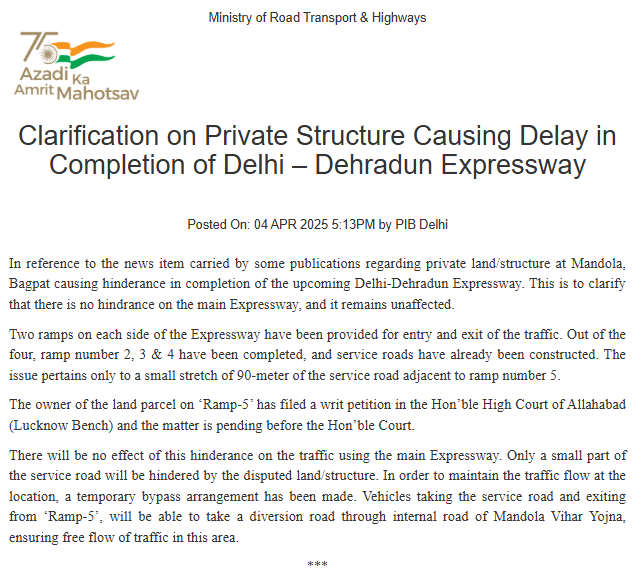 Ministry of Road Transport and Highways have issued a release for the same. The release mentioned, “In reference to the news item carried by some publications regarding private land/structure at Mandola, Bagpat causing hinderance in completion of the upcoming Delhi-Dehradun Expressway. This is to clarify that there is no hindrance on the main Expressway, and it remains unaffected.”