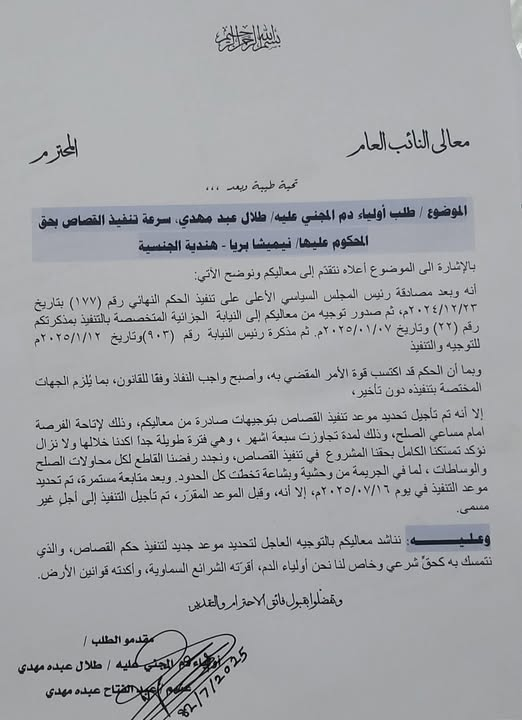 The clarification came as Abdul Fattah Mahdi, publicly appealed to Yemen’s Attorney General for the immediate enforcement of the court’s ruling. He cited that the family is continuously demanding qisas—a form of retributive justice under Islamic law that allows for the death sentence in murder cases (Sharia law).