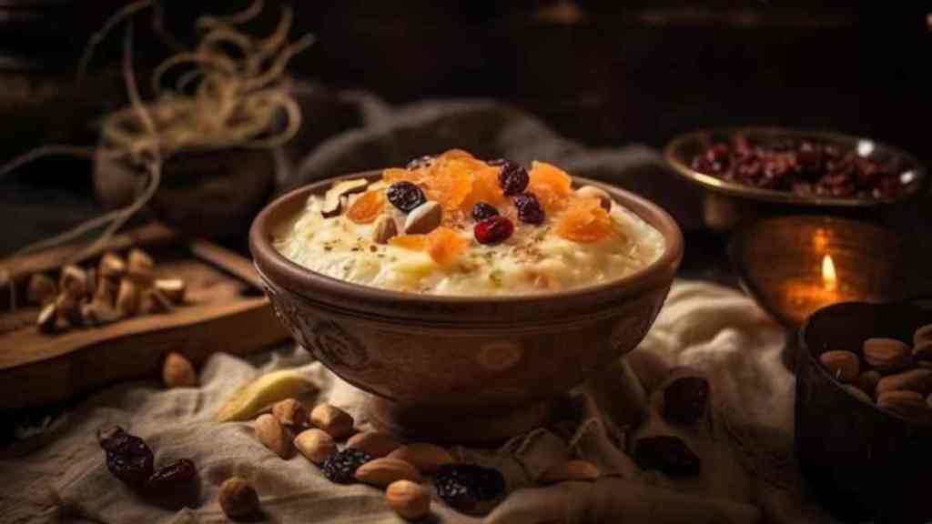 Phirni is a rich, creamy rice dessert, flavored with saffron and cardamom to end the meal on a sweet note.