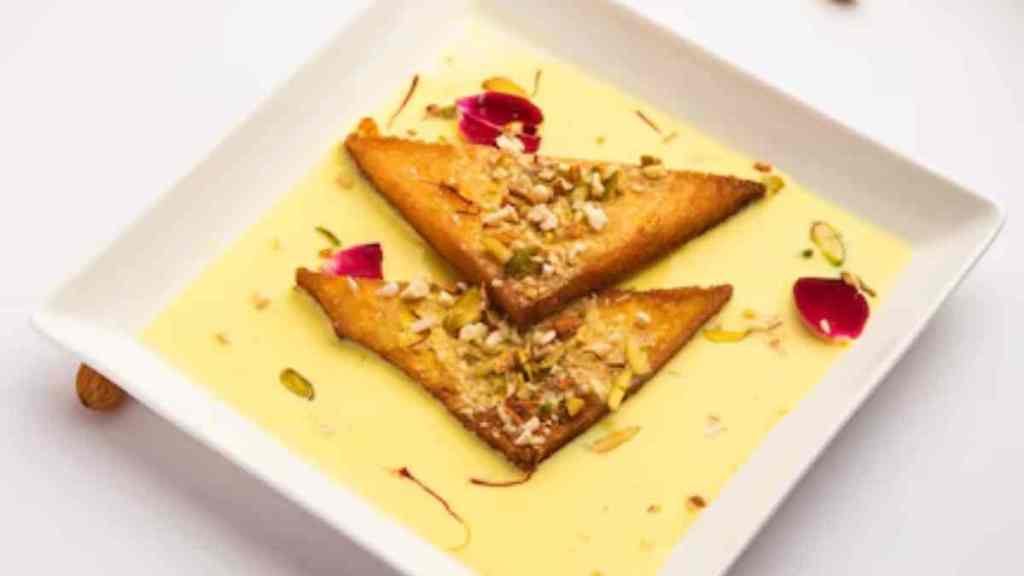 It is a royal dessert made with fried bread, soaked in sugar syrup, and topped with thickened saffron milk and nuts.