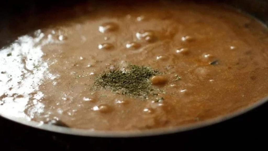 5. Add tomato puree, spices, and cooked lentils with stock, simmer on low heat, stirring often, and adjust consistency with water.