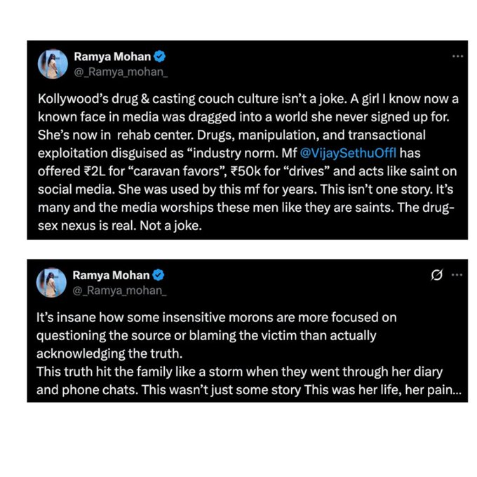 Ramya claimed that a woman she knew, now a recognisable media figure, endured years of emotional and physical exploitation by Vijay Sethupathi, driving her to seek rehabilitation. She alleged that Sethupathi offered money for inappropriate favours, disguising it as an industry norm, and condemned the toxic environment hidden behind the facade of glamour and false morality.