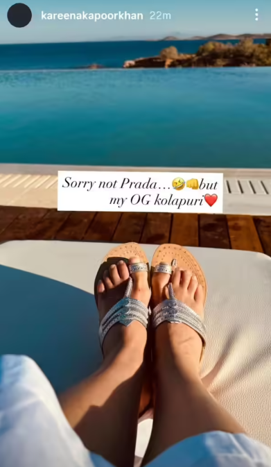 Actress Kareena Kapoor Khan reacted to this controversy on her Instragram handle. Kareena shared a cosy glimpse of her holiday in a fun way on her Instagram story, where she was seen sitting with her legs stretched out on a sun lounger and metallic silver Kolhapuri chappals on her feet. She wrote in the caption, “Sorry, it’s not Prada… (laughter and punch emojis) but my original Kolhapuris (heart emoji).”