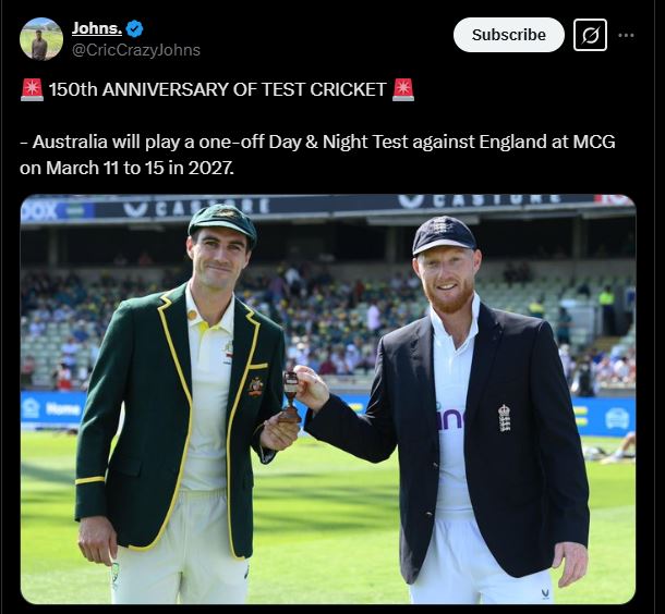 ENG vs AUS: England and Australia eyeing to play one -off Day-Night Test match to mark the occasion of 150th anniversary of Test cricket in 2027.