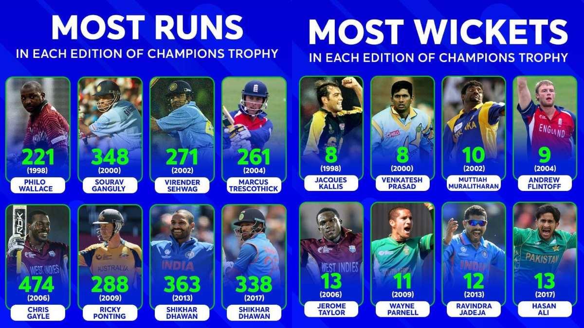 Virender Sehwag achieved the record run total of 261 in the 2004 edition. During the 2006 installment West Indian batsman Chris Gayle earned 474 runs to claim the leading position. During the 2009 tournament Ricky Ponting of Australia finished with 288 runs while Shikhar Dhawan of India became the leading run-scorer in 2013 with 363 runs. During the 2017 competition Dhawan achieved 338 batting runs which made him the main run-producer for that season.