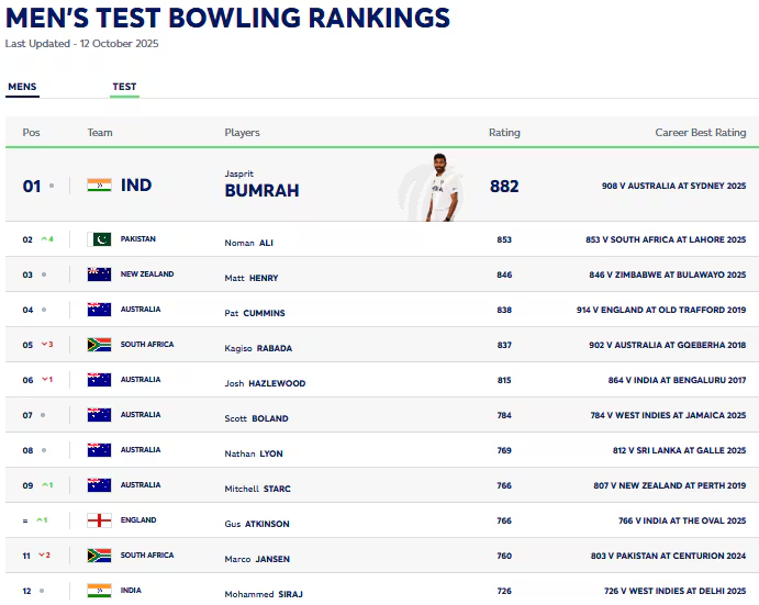 India’s star pacer Jasprit Bumrah continues to dominate the Test bowling rankings with 882 points and still goes strong as he took seven wickets in the recently concluded two-match Test series against West Indies. South Africa’s Kagiso Rabada has slipped from No.2 to No.5 spot while Australia’s Josh Hazlewood has also dropped by one spot and he now holds the sixth position. But Hazlewood made impressive progress in the ODI rankings and climbed six places to reach No.10 spot.