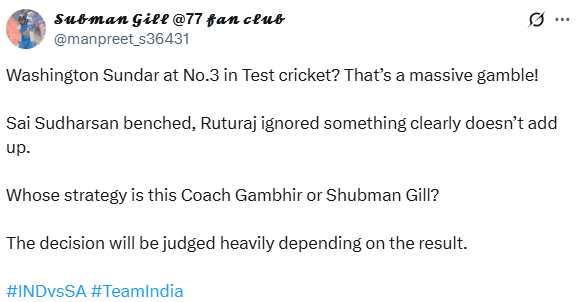 Team India’s playing XI in first Test against South Africa has raised many questions as all rounder Washington Sundar is most likely to bat at no. 3 while Sai Sudharsan who was supposed to bat on this position is excluded. The decision has sparked immediate debates among fans and experts, especially as India have also opted for a spin heavy attack for the series opener.
