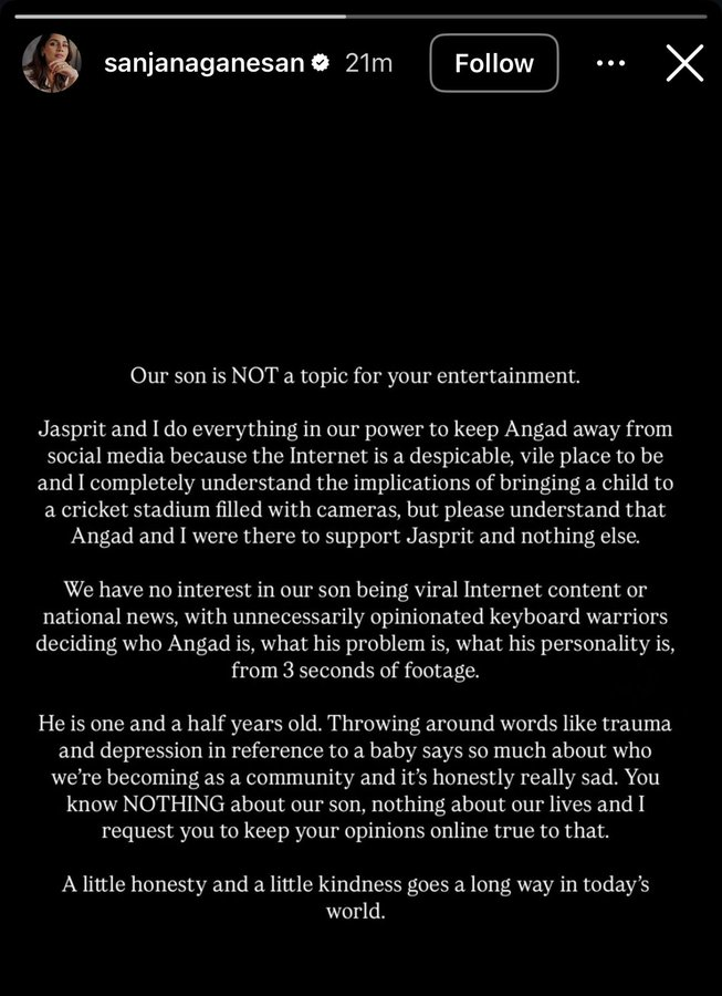 “Jasprit and I do everything in our power to keep Angad away from social media because the Internet is a despicable, vile place to be and I completely understand the implications of bringing a child to a cricket stadium filled with cameras, but please understand that Angad and I were there to support Jasprit and nothing else.”