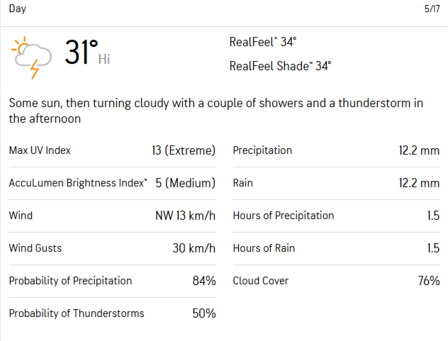 The weather conditions for RCB vs KKR game at M. Chinnaswamy Stadium are highly unpredictable. According to AccuWeather, there is 76% cloud cover with an immense chance of rain at 84%, and 50% thunderstorms predicted. The dense cloud cover indicates that the game is likely to be disrupted by rains, and the thunderstorms can further disrupt the play.