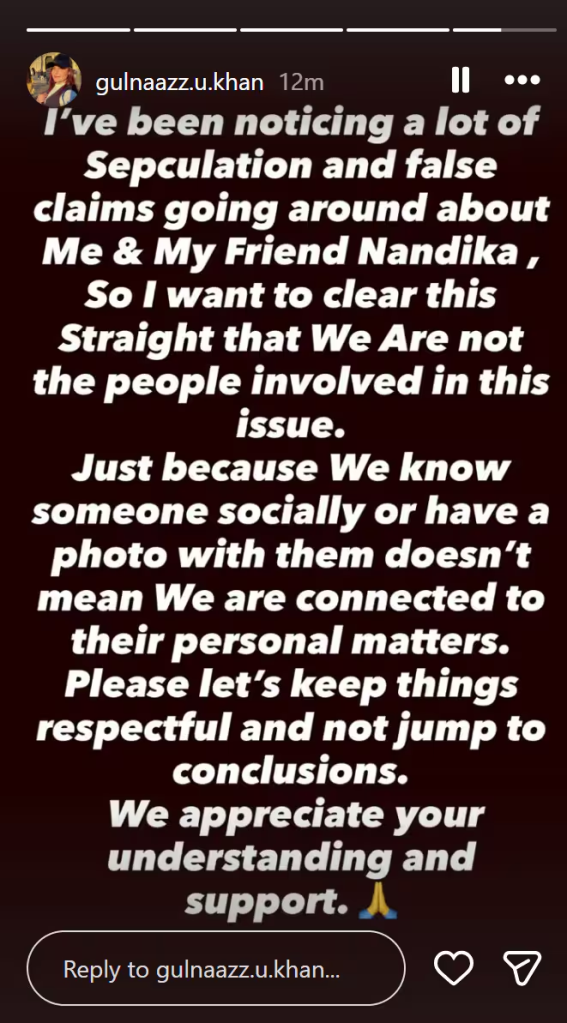Gulnaaz took to her Instagram account and wrote: “I’ve been noticing a lot of speculation and false claims going around about Me & My Friend Nandika, so I want to clear this Straight that We Are not the people involved in this issue.