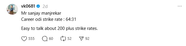 “Mr. Sanjay Manjrekar. Career ODI strike rate: 64.31. Easy to talk about 200 plus strike rates,” the post read.