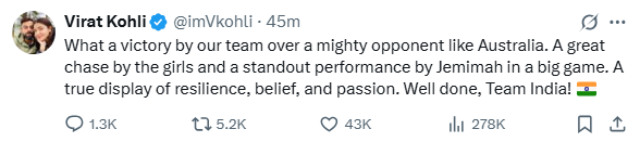 “What a victory by our team over a mighty opponent like Australia. A great chase by the girls and a standout performance by Jemimah in a big game. A true display of resilience, belief, and passion. Well done, Team India,” Virat Kohli posted.