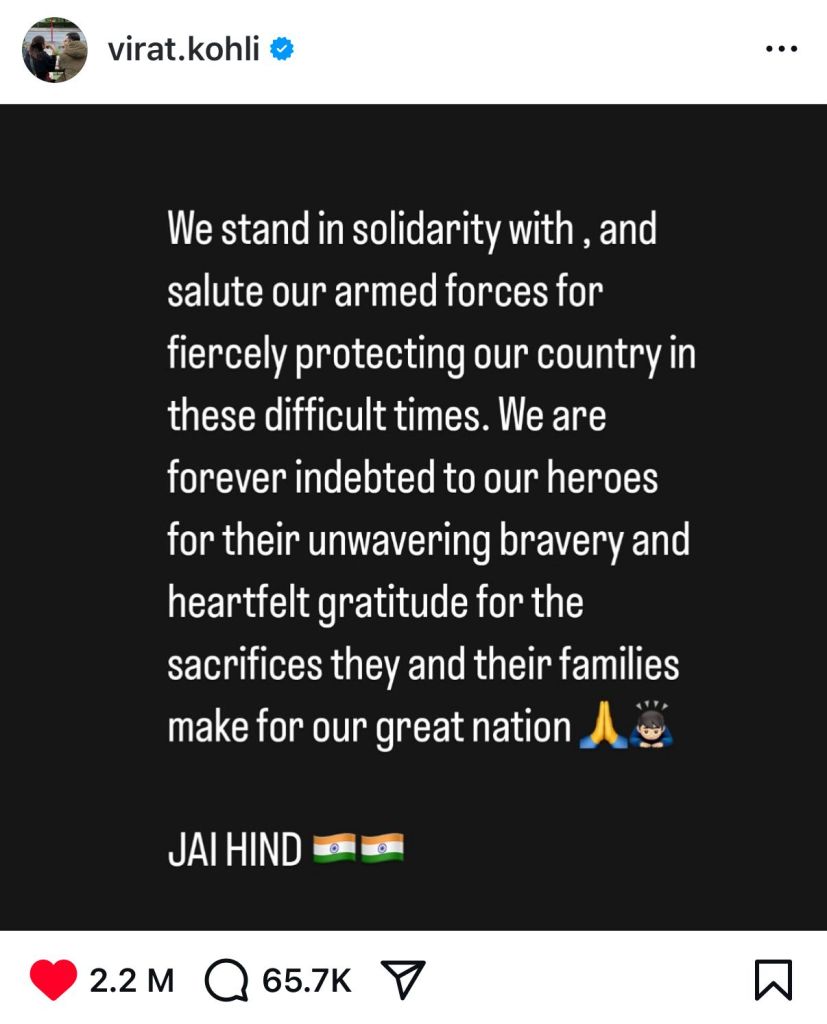 Virat Kohli took to his Instagram and expressed his gratitude towards India’s armed forced and the whole nation stands in solidarity in these tough times.