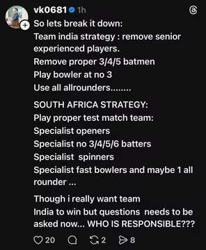 Vikas also drew a comparison between India’s approach and that of South Africa. He believed that the Proteas stuck to picking a proper Test team, while India dropped their seniors, filled their XI with all-rounders and even sent in Washington Sundar as high as No. 3. He was optimistic about an unlikely comeback on the fifth day in Guwahati but maintained that someone needs to be held accountable for this situation.