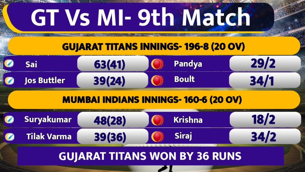 Gujarat Titans (GT) achieved an outstanding performance by defeating Mumbai Indians (MI) by 36 runs at the IPL 2025 match held at the Narendra Modi Stadium in Ahmedabad. Facing the opening batting slot Sudharsan maintained his batting excellence by producing 196 challenging runs along with his teammates. Mumbai Indians started their batting effort with a sluggish run rate to finish at 160/6 in twenty overs. Mohammed Siraj delivered the deciding blows to eliminate Rohit Sharma who made eight runs from four balls while Ryan Rickelton managed six runs from nine deliveries. For the fourth consecutive year, Mumbai Indians have lost their opening two games.