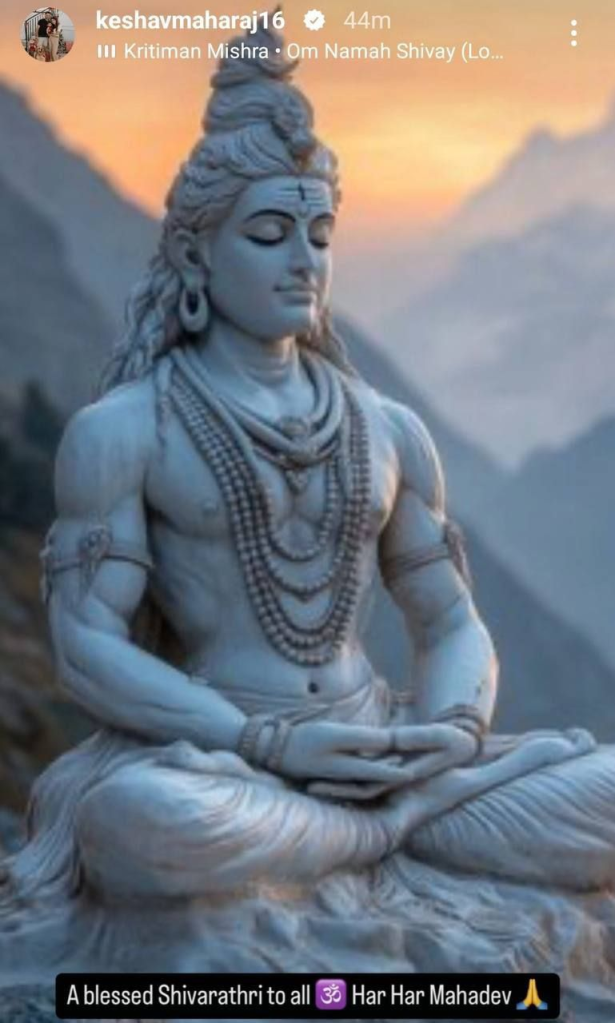 Proteas Keshav Maharaj, who is currently part of the Champions Trophy squad for South Africa, posted on his Instagram wishing everyone on the auspicious occasion of Mahashivratri. Maharaj, who is currently the Vice-Captain for the South African team in the White ball format, has deep Indian origins. He is also the captain of the Durban Super Giants in SA20. He wrote on his Instagram story, “A Blessed Shivratri to all. Har Har Mahadev”