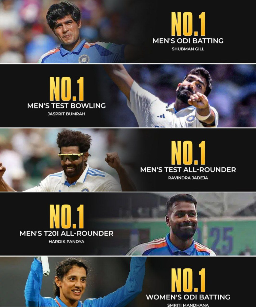 India is currently ruling the cricket world with top players across all formats. Shubman Gill is ranked No. 1 in Men’s ODI batting, showing his great form in one-day matches. Jasprit Bumrah is No. 1 in Men’s Test bowling, making him the best bowler in the longest format. Ravindra Jadeja holds the spot for No. 1 Men’s Test all-rounder, proving his value with both bat and ball. In T20Is, Hardik Pandya is the No. 1 Men’s T20I all-rounder, a key player in short-format matches. On the women’s side, Smriti Mandhana is the No. 1 ODI batter, showing her dominance in women’s cricket.