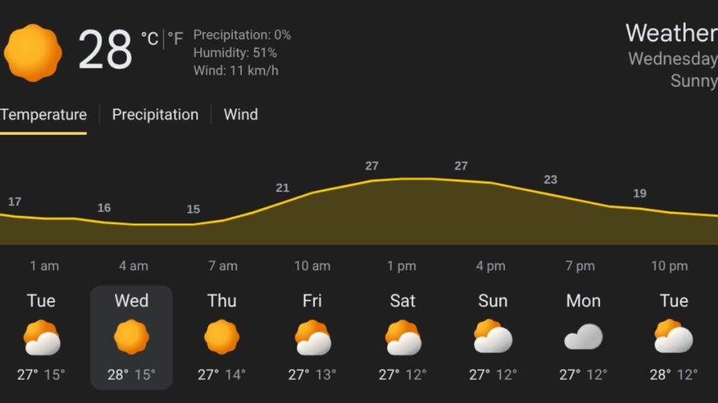 The weather of Raipur will be all clear with zero precipitation chances with the temperature of 28 degree high and 15 degree low.