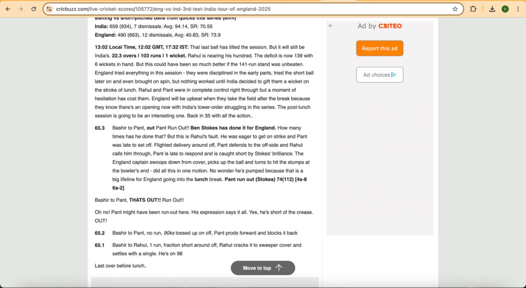 Cricbuzz covers a live commentary for almost every cricket match that takes place, regardless of India being part of it. A similar situation was on July 12, when a live commentary was taking place of the third Test match between India and England at the iconic Lord’s. The runout came on the third ball of the 65th over when Shoaib Basheer came into the attack with the ball, and Pant responded with a defence through the covers. The English skipper Ben Stokes came from the covers and threw the ball towards the bowler’s end, which sent Pant back to the hut.