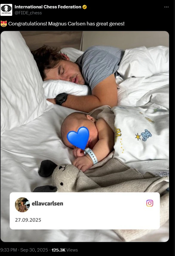 Chess champion Magnus Carlsen and wife Ella Victoria embarked on a new journey in life as they welcomed their first child. Ella broke the news on social media on Saturday, September 27, sharing an adorable photograph of Carlsen sleeping next to their newborn a moment that touched the chess world immediately. FIDE also sent its regards, joining the flood of congratulatory messages.