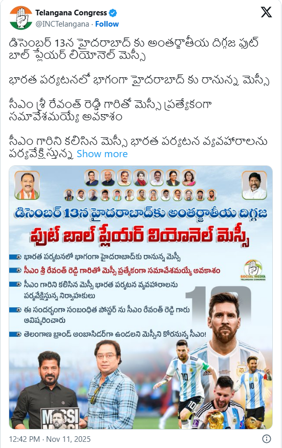Messi will be visiting the city on December 13, as confirmed by the Telangana Chief Minister prior to his arrival. It is a historic event in Hyderabad with the Argentine legend more likely to meet with fans during his visit to the city, where he is likely to be involved in special celebratory events.