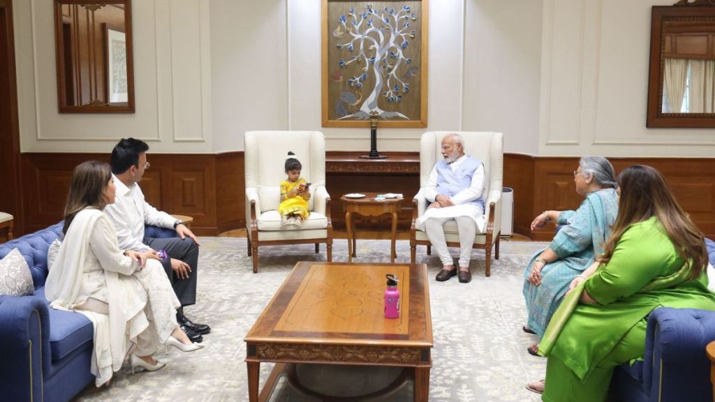 Prime Minister Narendra Modi recently met the family of his close friend, the late Arun Jaitley, in a heartfelt gesture of remembrance and respect. Among those present were Rohan Jaitley, his wife Meherunissa Anand, his mother Sangeeta Jaitley, sister Sonali Jaitley Bakhshi and daughter.
