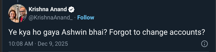 — Ashwin 🇮🇳 (@ashwinravi99) December 9, 2025