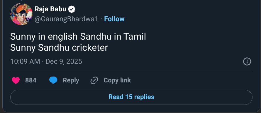 While many people tried to figure out what Ashwin was hinting at, some sharp-eyed fans quickly connected the dots. The post was actually a playful shoutout to Tamil Nadu all-rounder Sunny Sandhu, who recently made his T20 debut in the ongoing Syed Mushtaq Ali Trophy.