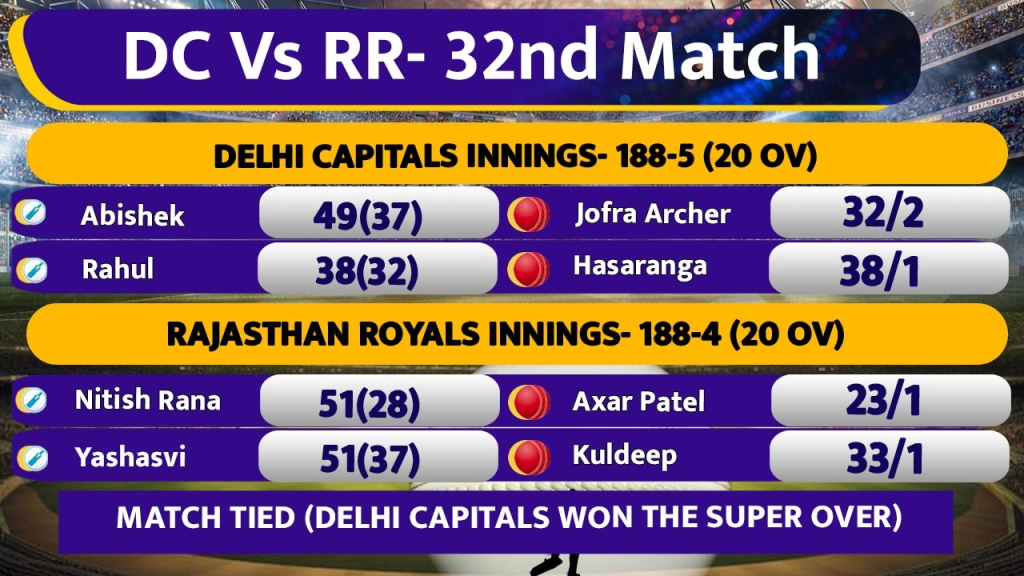 The first three balls of the Super Over began with two boundary hits for Rajasthan Royals. The match took a turn for the worst for Rajasthan as their pair of batters became victims of run-out when Parag and Jaiswal were dismissed. This resulted in their team scoring 11/2. The hunting of 12 runs for victory became possible for Delhi when Stubbs and Rahul handled Sandeep Sharma’s excessively foreseeable slower deliveries that entered the pitch too often.