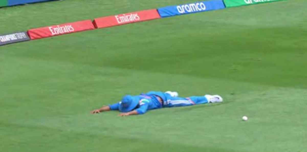On the opening delivery of the seventh over Shreyas Iyer made a desperate attempt to take Rachin Ravindra out with a catch near deep mid-wicket against Varun Chakaravarthy. Iyer ran 21 meters toward deep mid-wicket as Ravindra attempted a slog sweep that produced an aerial hit before crashing into the turf at the end of his 21-meter sprint. The catch remained out of reach for Iyer although he made an impressive running approach followed by an extended-arm dive. After hitting his hands the ball escaped his grasp allowing Ravindra to continue batting and New Zealand to score two runs. Rachin was later bowled by Kuldeep Yadav during the 10th over.