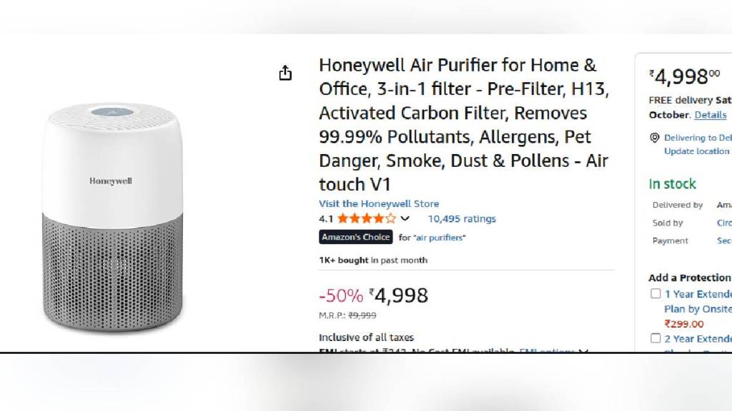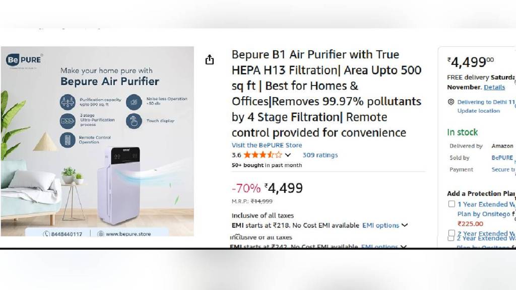 The Bepure air purifier offers a two-stage purification process and covers up to 500 sq ft. It has a touch display and remote-control operation. The air purifier has both inlet and outlet vents. It comes with a pre-filter that removes hair and dust, a second filter that handles smoke, pollen, and PM2.5 particles, and an activated charcoal filter that effectively tackles foul smells and smoke. Bepure also sells a set of replacement filters priced at Rs 1,499. You can purchase the air purifier for Rs 4,499 on Amazon right now.