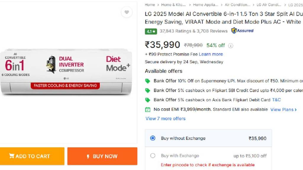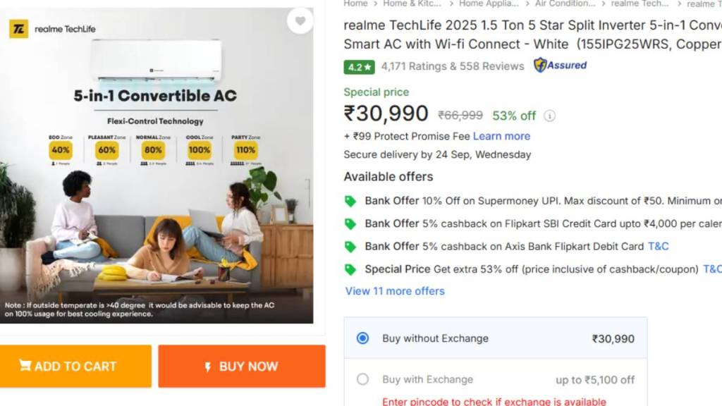 To ensure reliable performance in India’s extreme heat, the AC has been tested to operate at temperatures up to 55°C. It features a copper condenser and 4-way swing for enhanced and even cooling. Currently, it’s retailing at ₹30,990, and it’s likely to be available at an even lower price once the Big Billion Days sale begins.