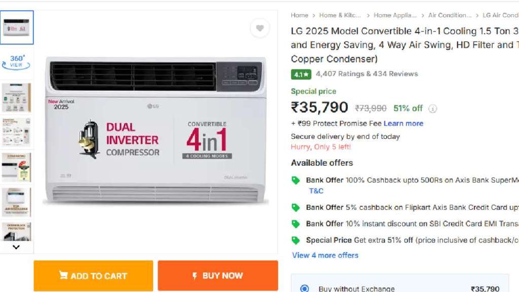 Although the AC might seem like its a bit more expensive than the other choices that we have listed, its advanced features make it a worthy choice. The AC has built in features like dual inverter compressor, low power consumption and low gas auto detection. The convertible 4 in 1 cooling helps the air conditioner customize its schooling pattern as per the need of the hour. The inverter compressor can modulate its performance based on the number of people in the room. Beyond that, the air conditioner provides the user with 4 way swing that would allow uniform airflow and multi way airflow as well. To ensure that the air conditioner is able to handle the Indian summers with ease it has been tested a 54 degree C. You can avail the air conditioner for Rs 35,790.
