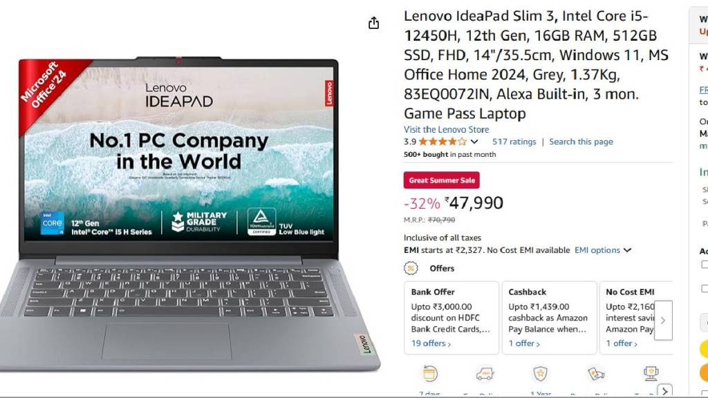 Lenovo IdeaPad Slim 3 is another great deal that you can go for, the laptop is powered by a intel core i5 processor with a 2.0 GHZ to 4.4 GHZ max clock speed with 8 cores and 12 Threads. Beyond that the real compromise would be that the Laptop has soldered RAM and hence its not upgradeable, stock its available with 16Gb of RAM. Out of the box the Laptop would be available with Windows 11 along with integrated Intel UHD graphics. The Laptop supports 47 WHR of battery life along with the support of rapid charge and adaptive performance. Available at Rs 47,990.