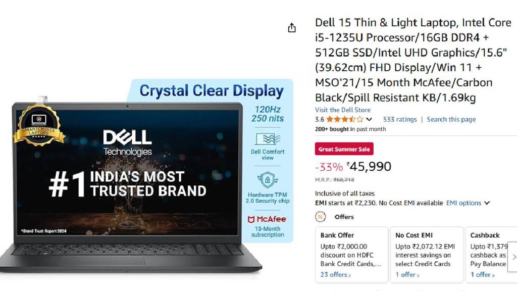 The Dell 15 inch laptop is equipped with a Intel Core i5 12Th gen processor that can clock up to 4.4 GHZ- the Laptop is available with 16Gb 2x8Gb , DDR4, 2666 Mt RAM and 512GB SSD. The Laptop would be delivered with Windows 11 out of the box with MS office and Mcafee multi device security. The Laptop has Intel UHD graphics that would be able to easily play some of the older gaming titles with ease. The Laptop has express charge capability and charges upto 80% in an Hour. The Laptop is right now available at a price of Rs 45,990 on amazon.